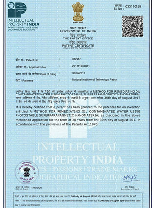P. Sukul, A. Mondal and S. Das "Superhydrophobic Photostable Dye Coated Magnetic Nano Materials for Separating Contaminated Oil" Indian Patent 2017, Patent No. 332217 (Granted)