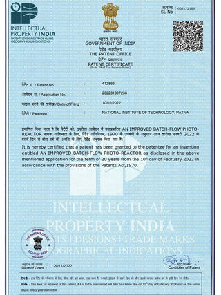 S. Das, S. Naskar, S. Mal, T. Das, P. Kumar "An improved batch-flow-photo-reactor" Indian Patent 2022 Patent no. 412866 (Granted).