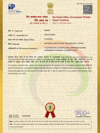 S. Das, T. Das, S. Mal, P. Kumar, D. Mandal. "Graphene quantum dots as nanozymes for neuronal stress suppression". Indian Patent 2023 Patent no. 534045 (Granted).