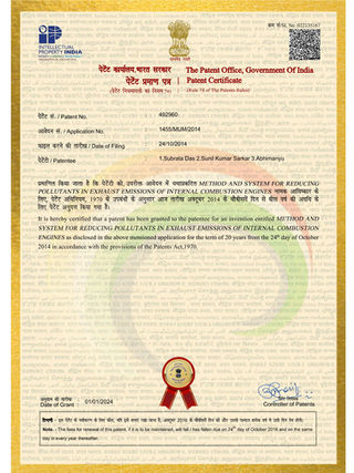 S. Das, A. Sarkar and Abhimunya “Method and system for reducing pollutants in exhaust emissions of internal combustion engine” Indian Patent 2014 Patent No. 492960 (Granted)